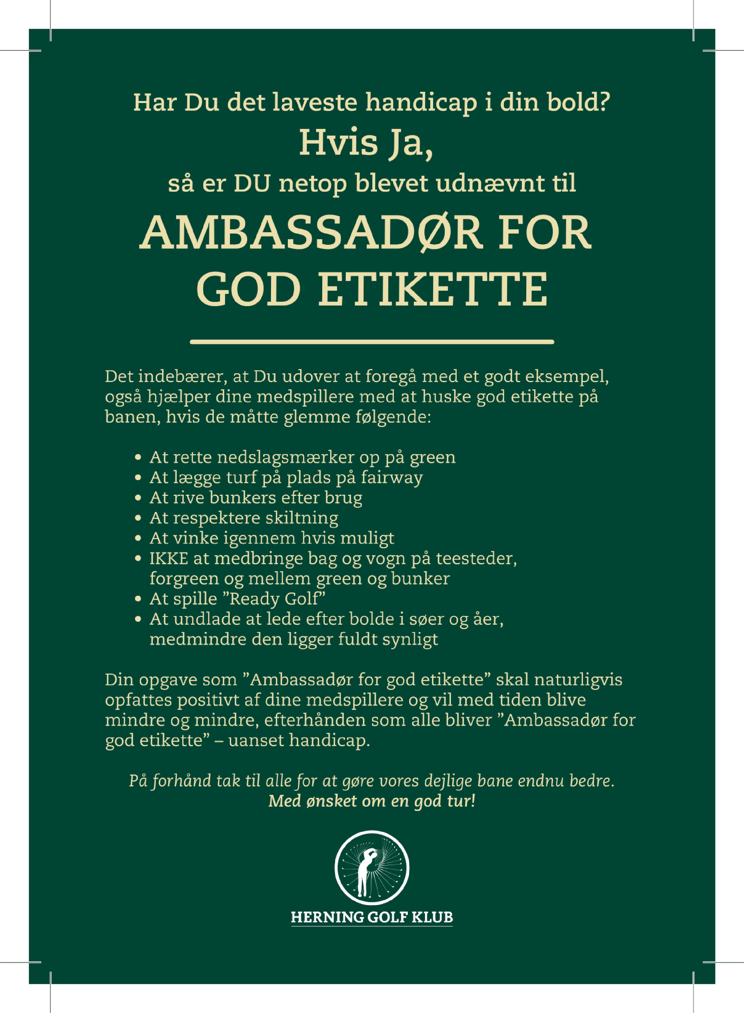 HUSK PAS PÅ banen; ret nedslagsmærker op, turfs på plads m.m. - se vores nye Etikette Ambassadør kampagne.