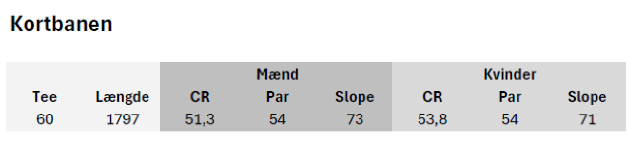 Se scorekort for hvilke nøgler, der skal benyttes til runderne. Handicappet er baseret på at man spiller 18 huller og man skal bruge nøglerne, som fremgår af scorekortet, når man spiller runderne. Eks. Hul 5, (11 og 17) har nøglerne 7, 8 og 10.