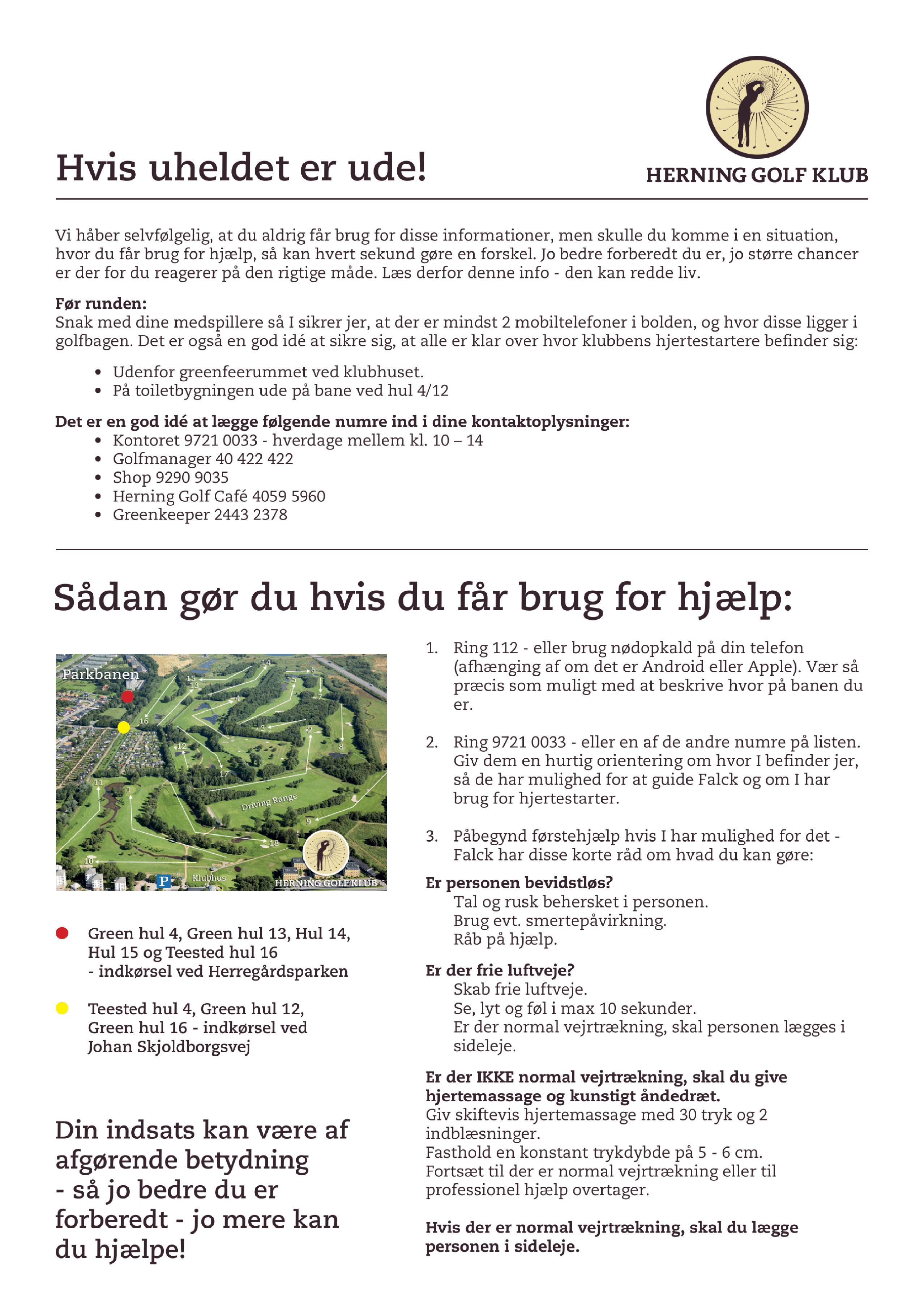 På banen findes der en hjertestarter ved toilettet mellem 4. og 17. teested (se her).