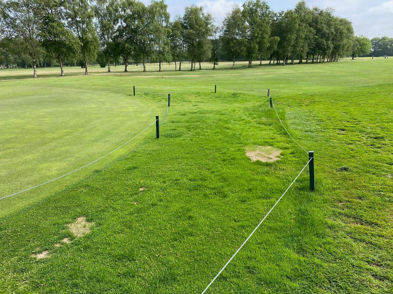 - Hul 2: Blå pæle tværs over fairway hul 2, hvor der er sand/nyt rullegræs/sået.