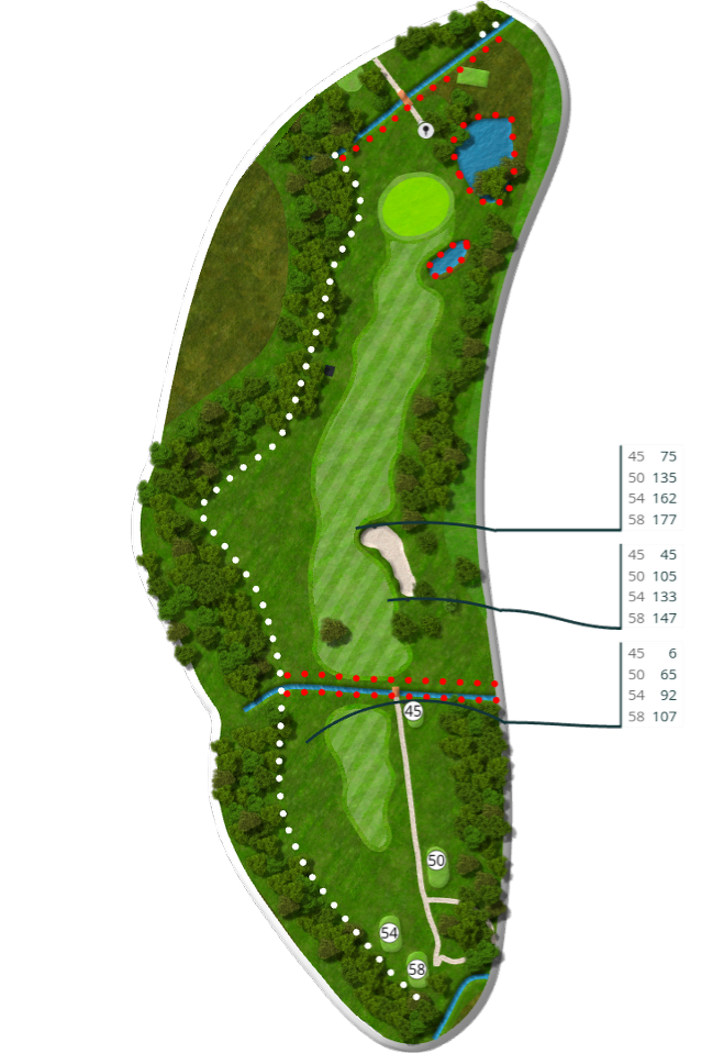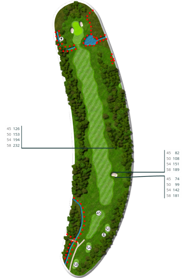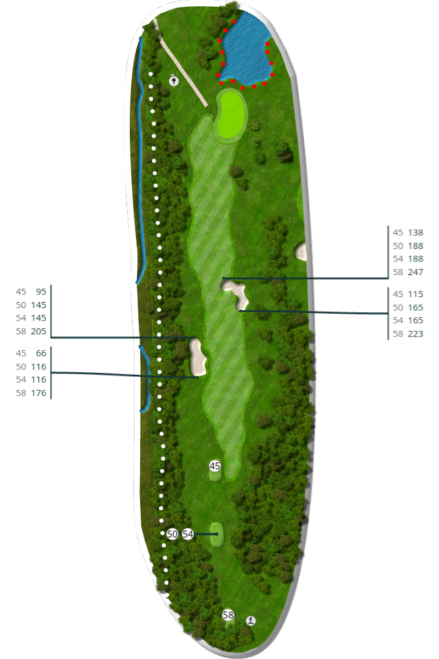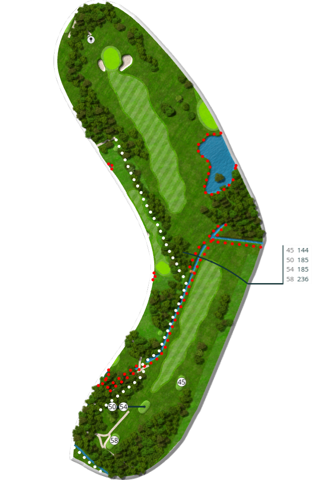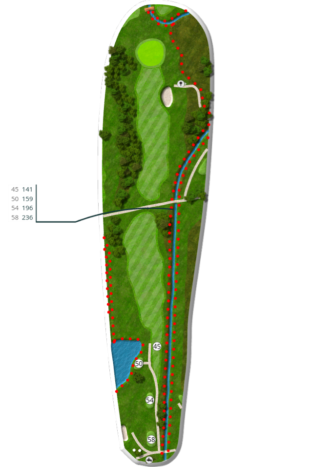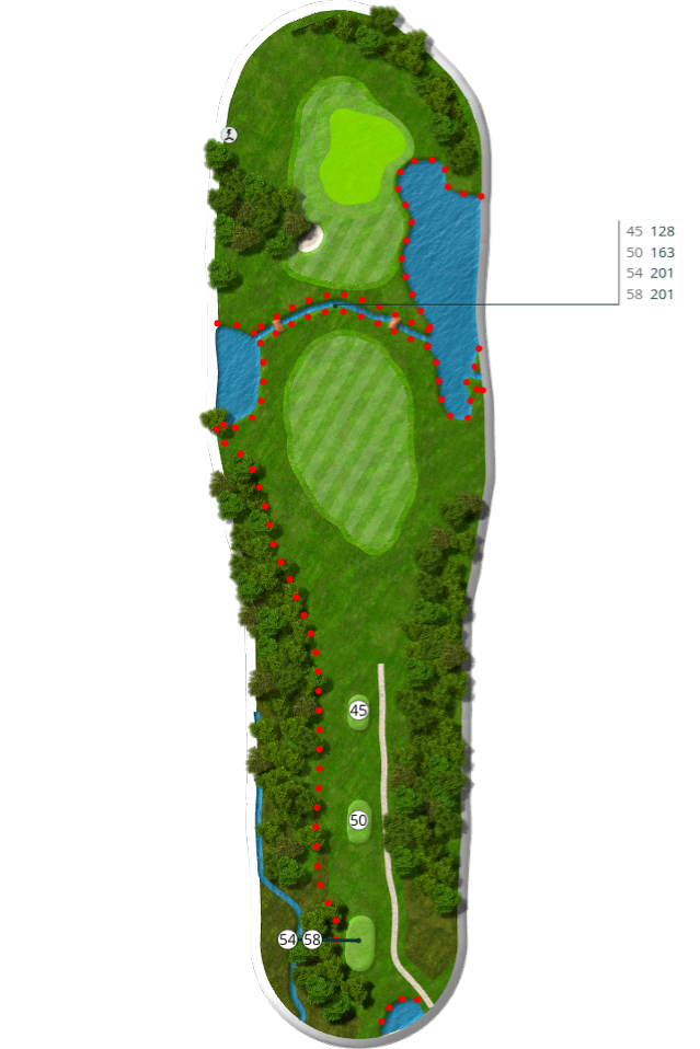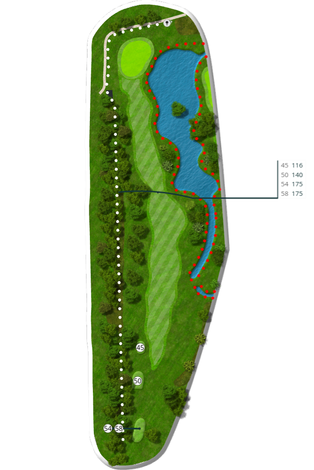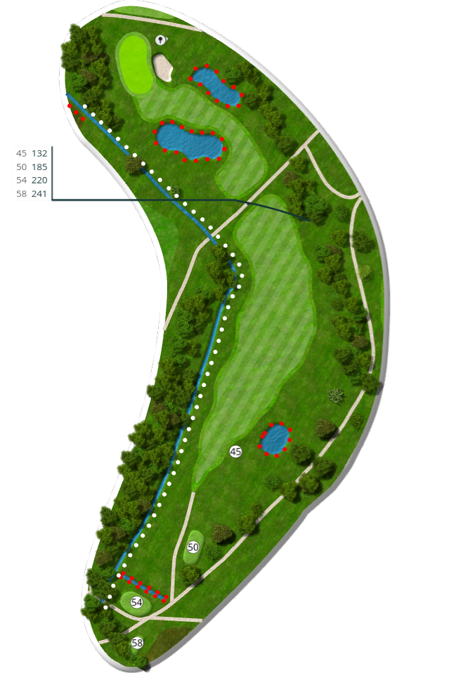 Der spilles fra tee 58 (5676 m), 54 (5105 m), 50 (4735 m) og 45 (4281 m).