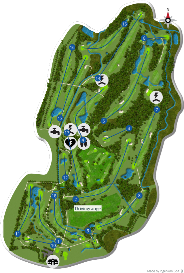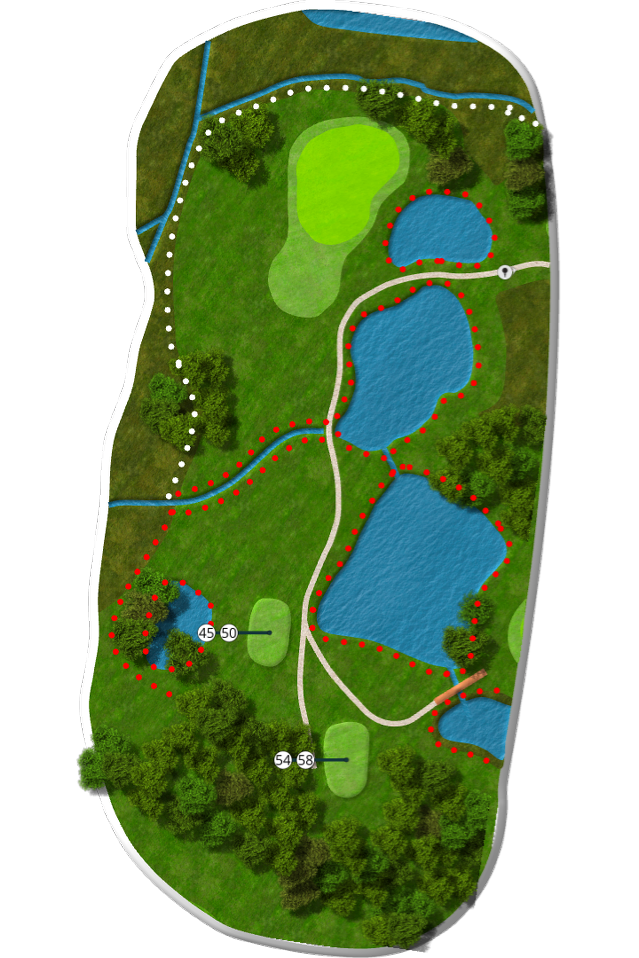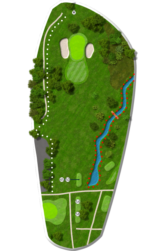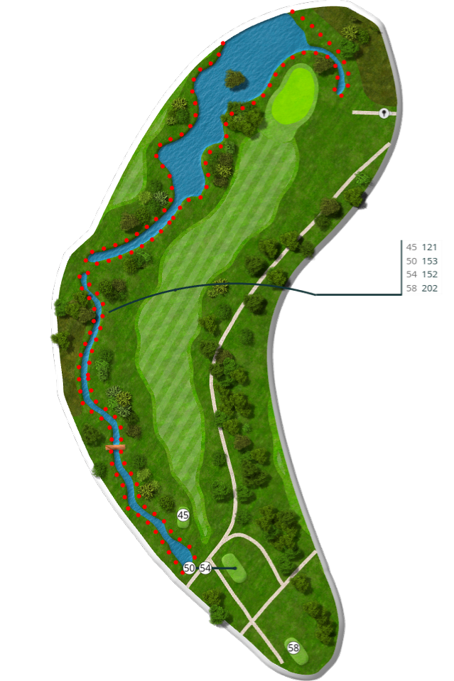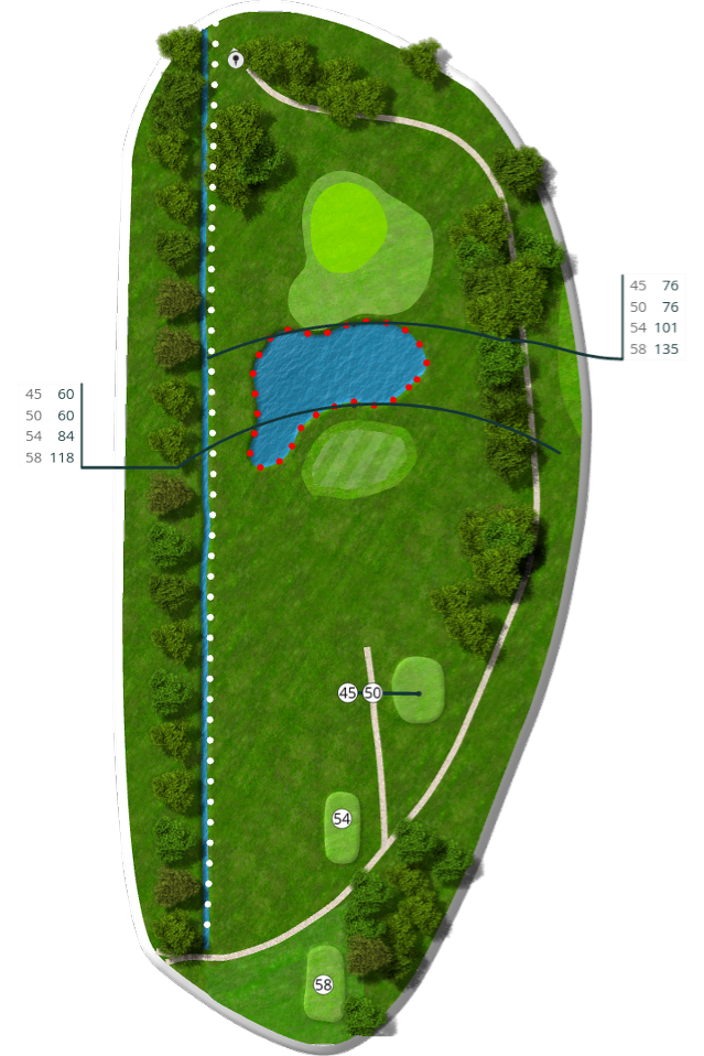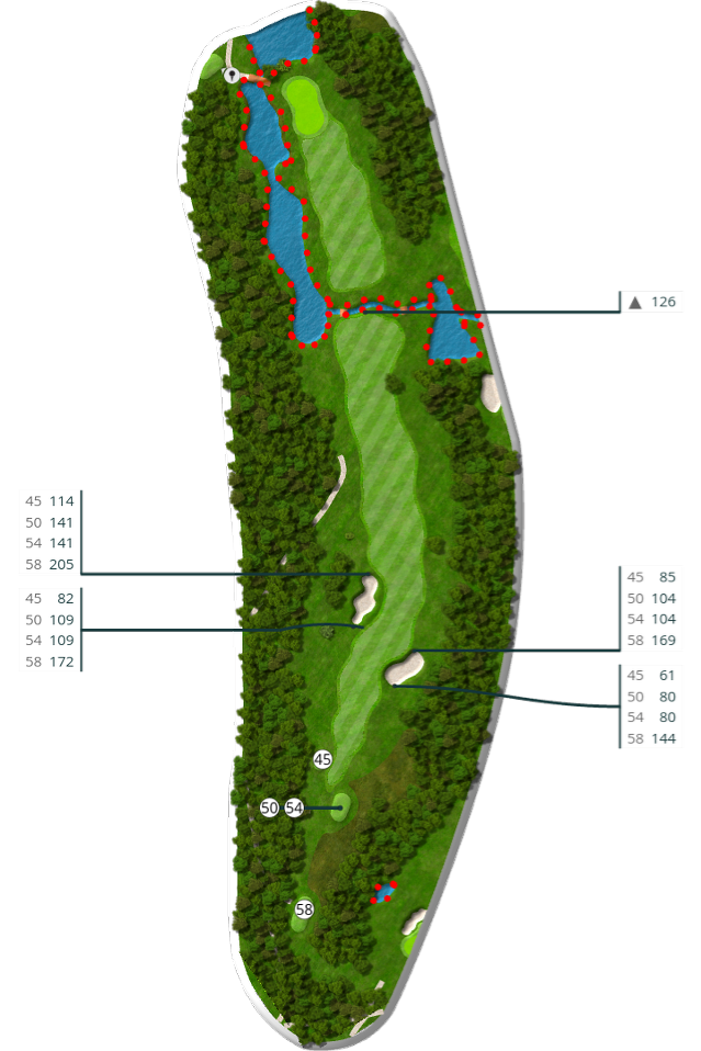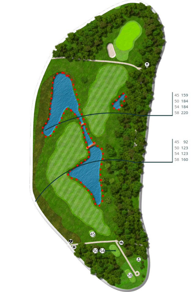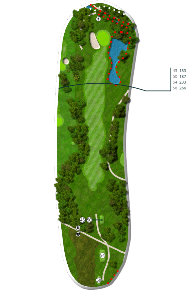 Der spilles fra tee 58 (5676 m), 54 (5105 m), 50 (4735 m) og 45 (4281 m).