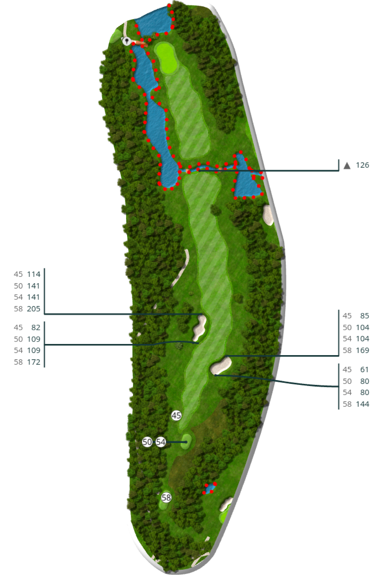 Green er beskyttet af søer både bagved og til venstre, så indspillet skal være præcist ind til denne store green, der hælder kraftigt nedad mod fairway.