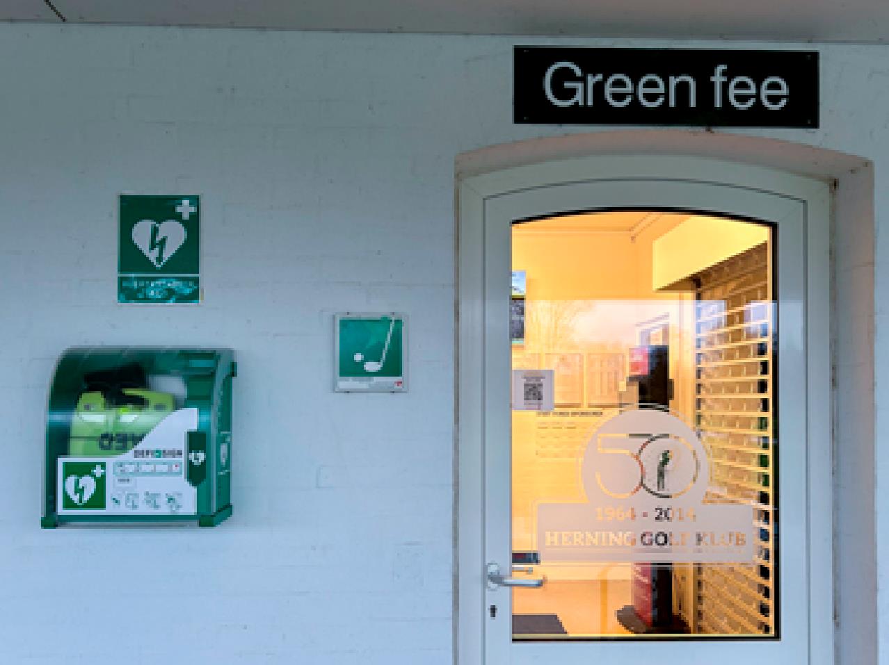 Der findes en hjertestarter lige udenfor døren ind til greenfeerummet.