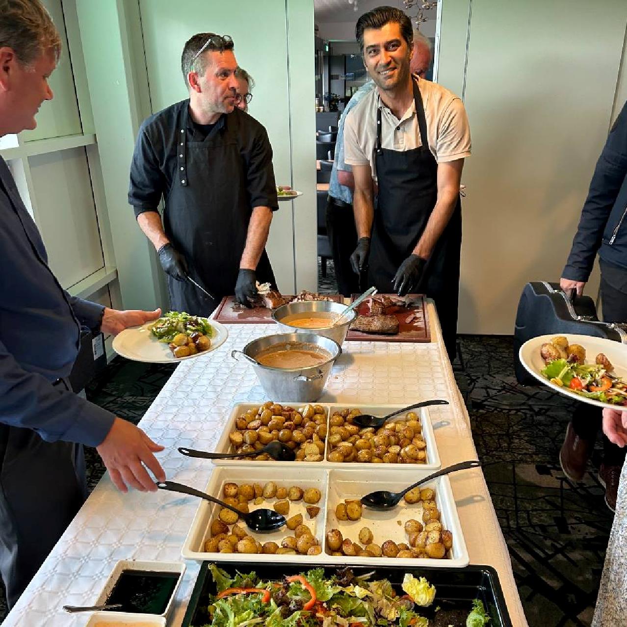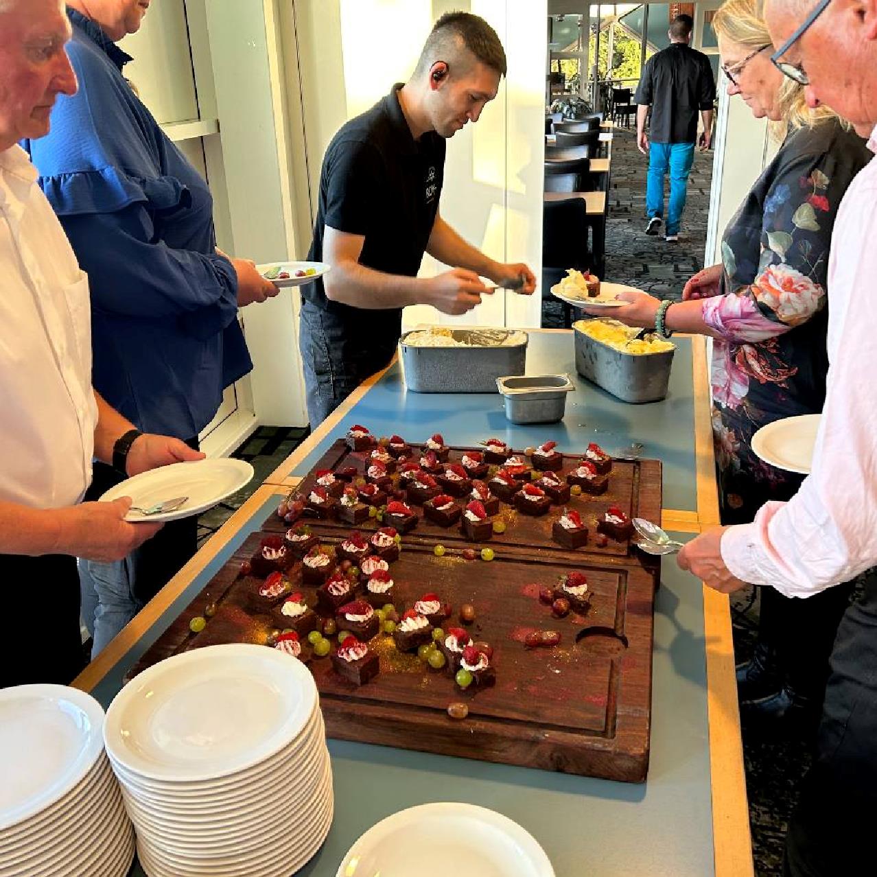 Maden var selvfølgelig leveret af Kuplen og den meget velttillavede menu bestod af en lækker forret bestående af Hvidløgsmarinerede tigerrejer og koldrøget laks på salatbund med pesto, aioli og rodfrugtscreme, med brød og smør.
