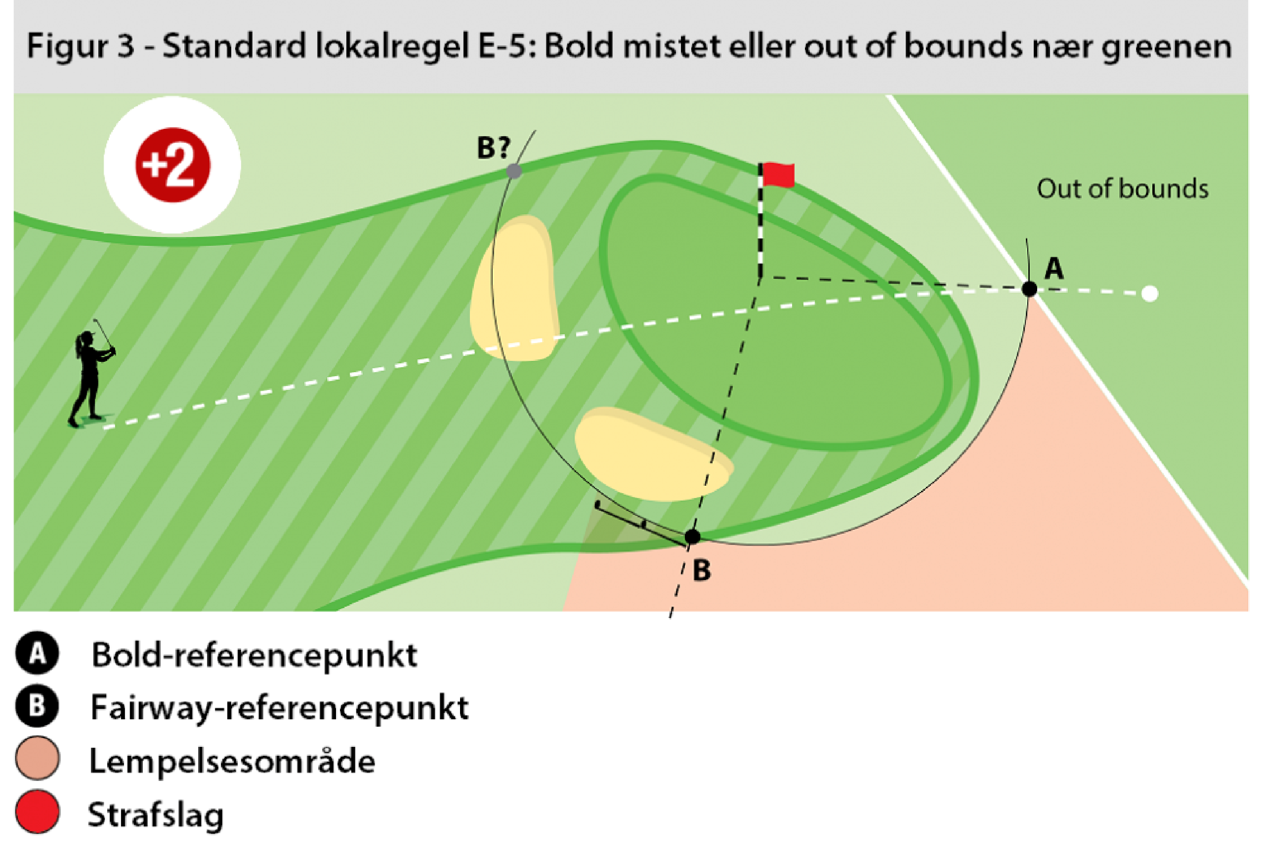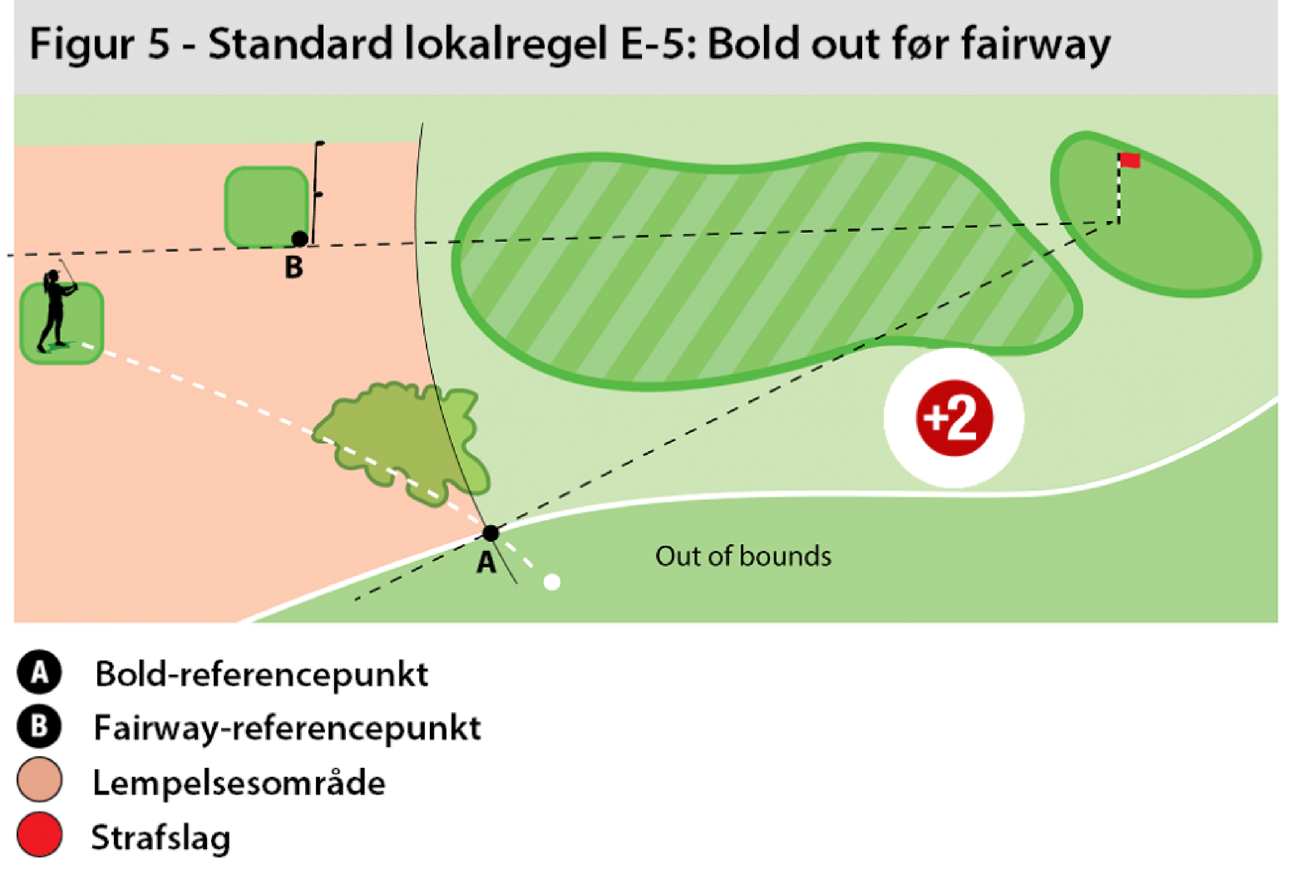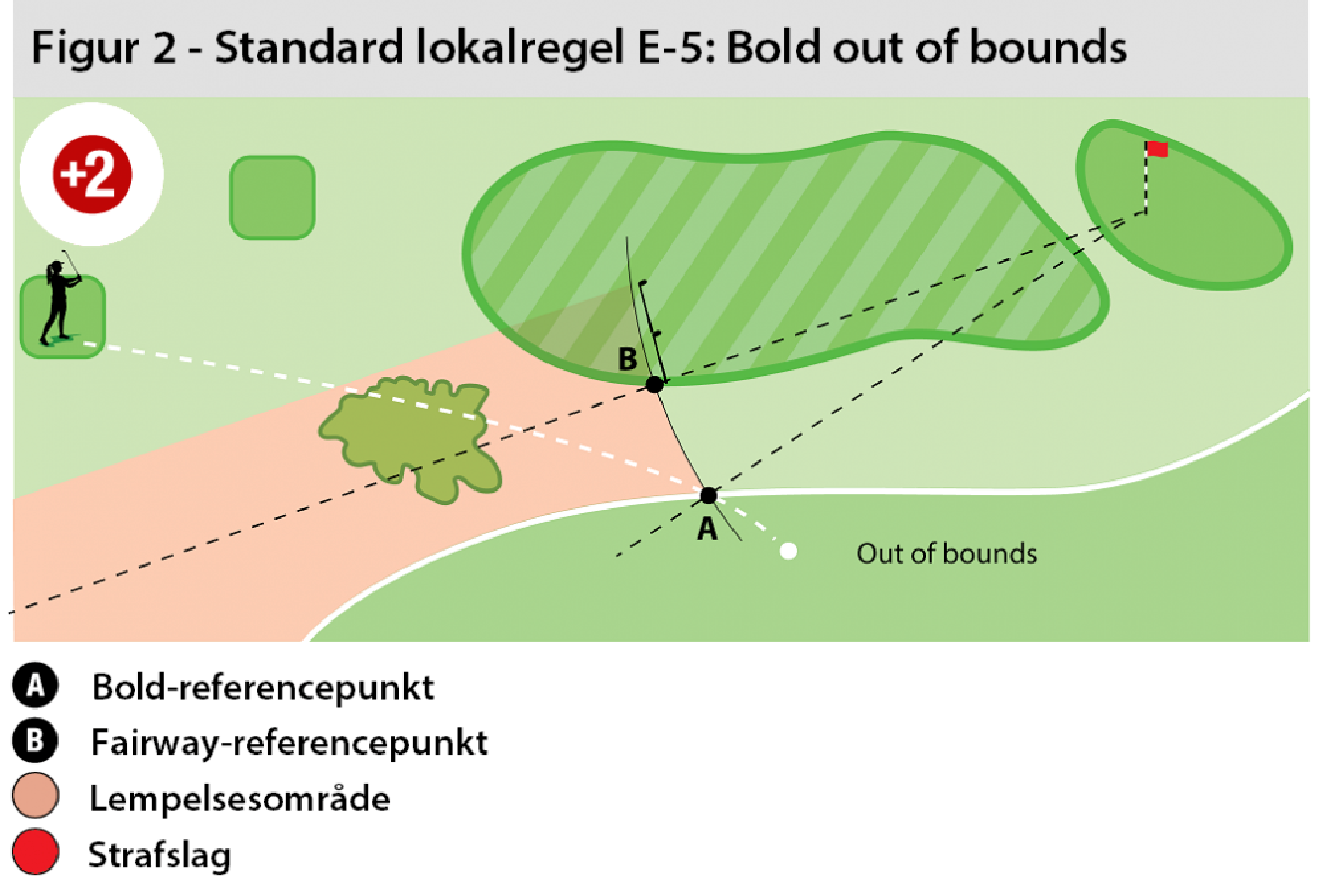 - en linje fra hullet gennem fairway-referencepunktet B (og inden for to køllelængder til fairwaysiden af den linje).